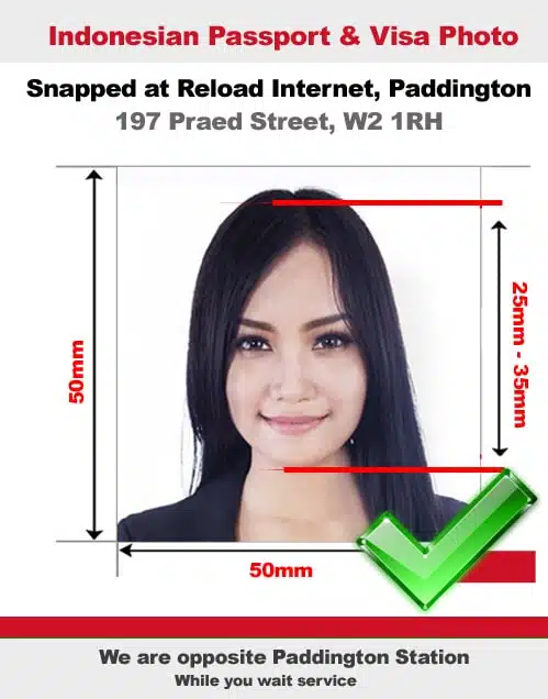 If you are in need of a Indonesian passport photo or visa photo and live in London, then come to Reload Internet in Paddington. We are a professional passport photo studio that has been in operation for over a decade and specialises in Indonesian passport and visa photographs. We can take and print your Indonesian passport photo or visa photo instantly in store, and have your photographs ready within 10 minutes of your arrival here! You won’t even need an appointment, just stop by our store and one of our trained photographers will be happy to assist you.
